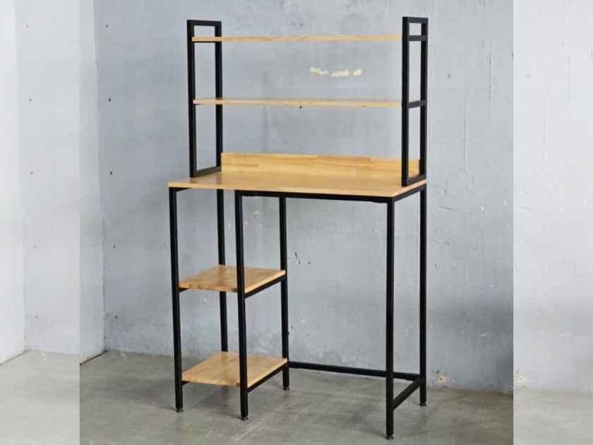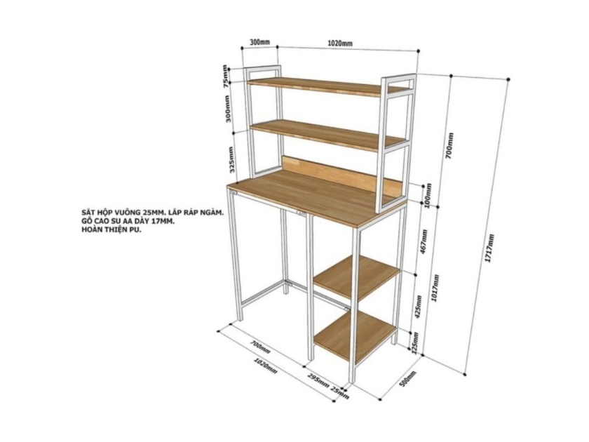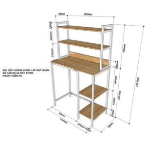 Khung kệ được làm từ sắt hộp vuông sơn tĩnh điện chắc chắn, có khả năng chịu lực tốt và hạn chế gỉ sét. Các mặt kệ sử dụng gỗ cao su tự nhiên hoàn thiện PU, mang lại độ bền cao và tính thẩm mỹ cho sản phẩm.